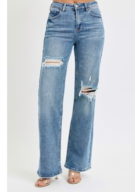 High Rise Wide Leg Ripped Jeans With Medium Wash