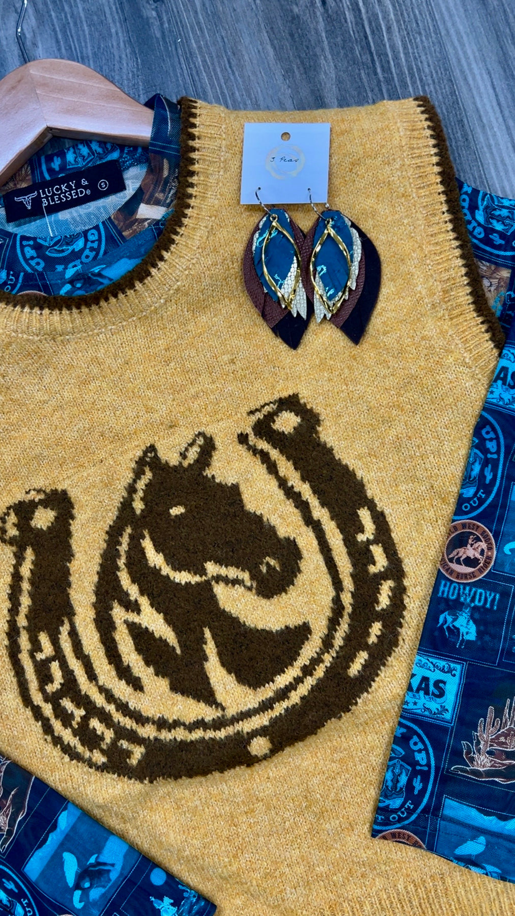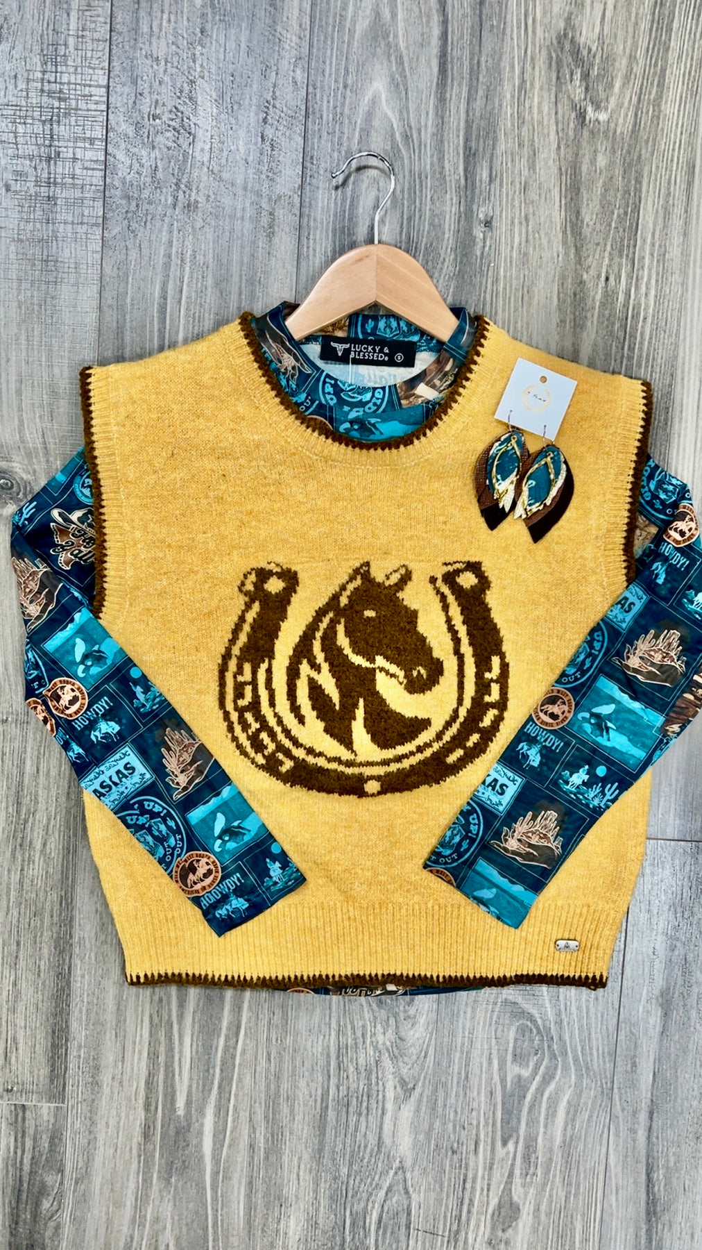 Mustard sweater vest with brown horse head and horseshoe trimmed in brown