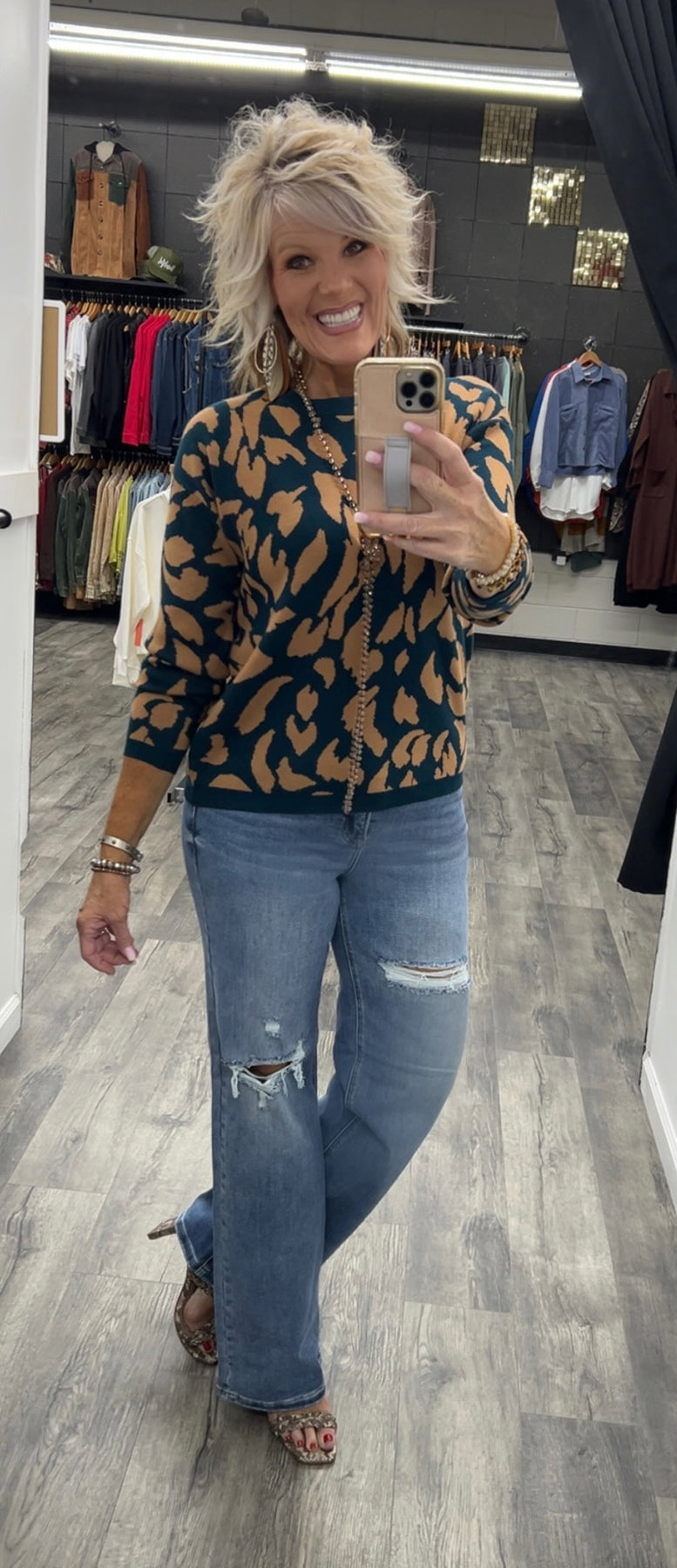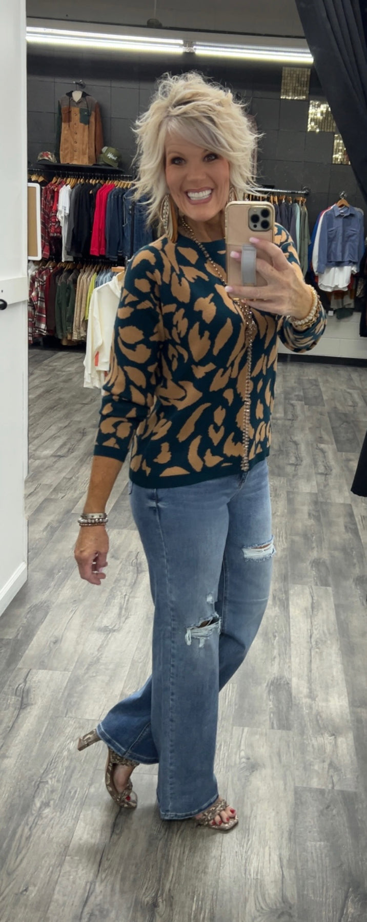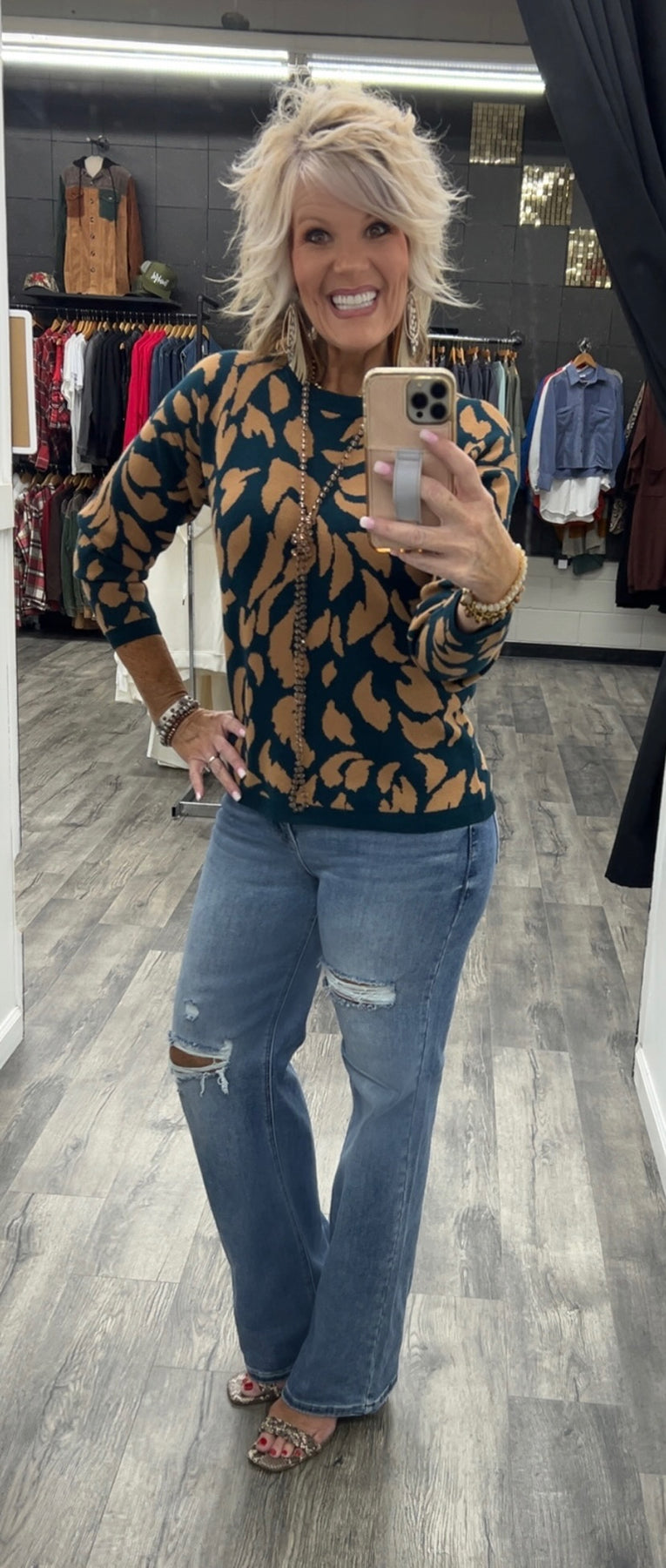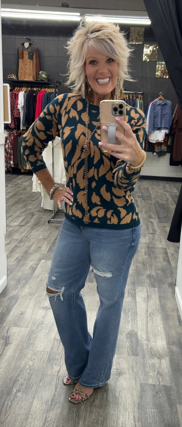 Deep teal long sleeve sweater with camel colored print leaf